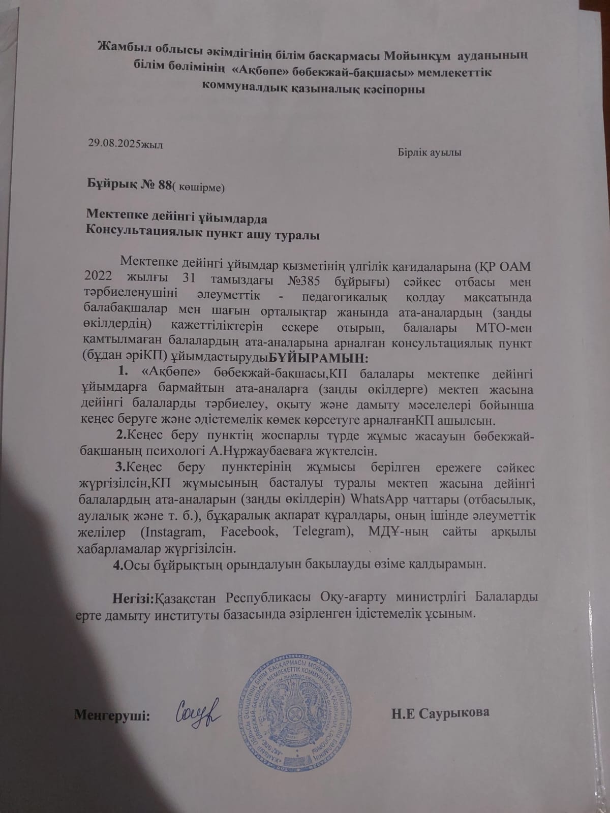 КП ұйымдастыру бойынша бұйрық » «Ақбөпе» бөбекжай-бақшасы